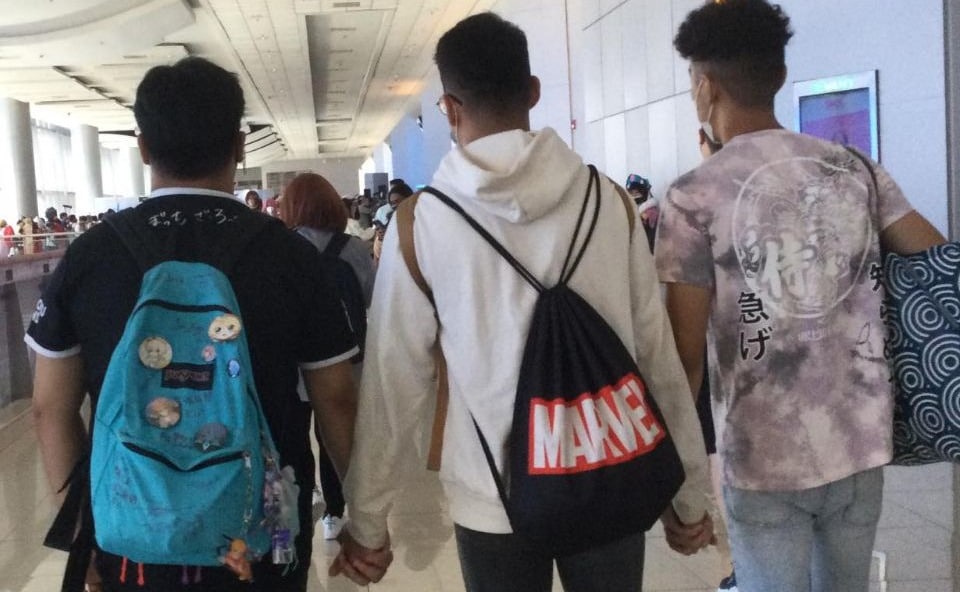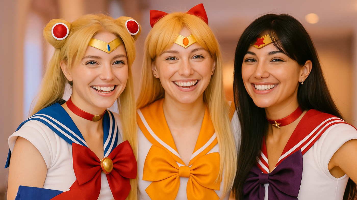 Candid moments of cosplay camaraderie at conventions—friends posing together, playful cross-fandom meetups, selfies, and interactions with attendees—capturing the joy of community and shared fandom.