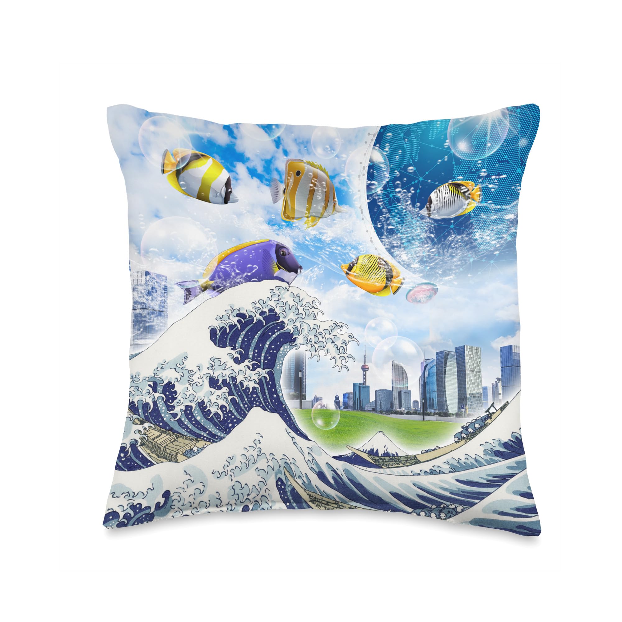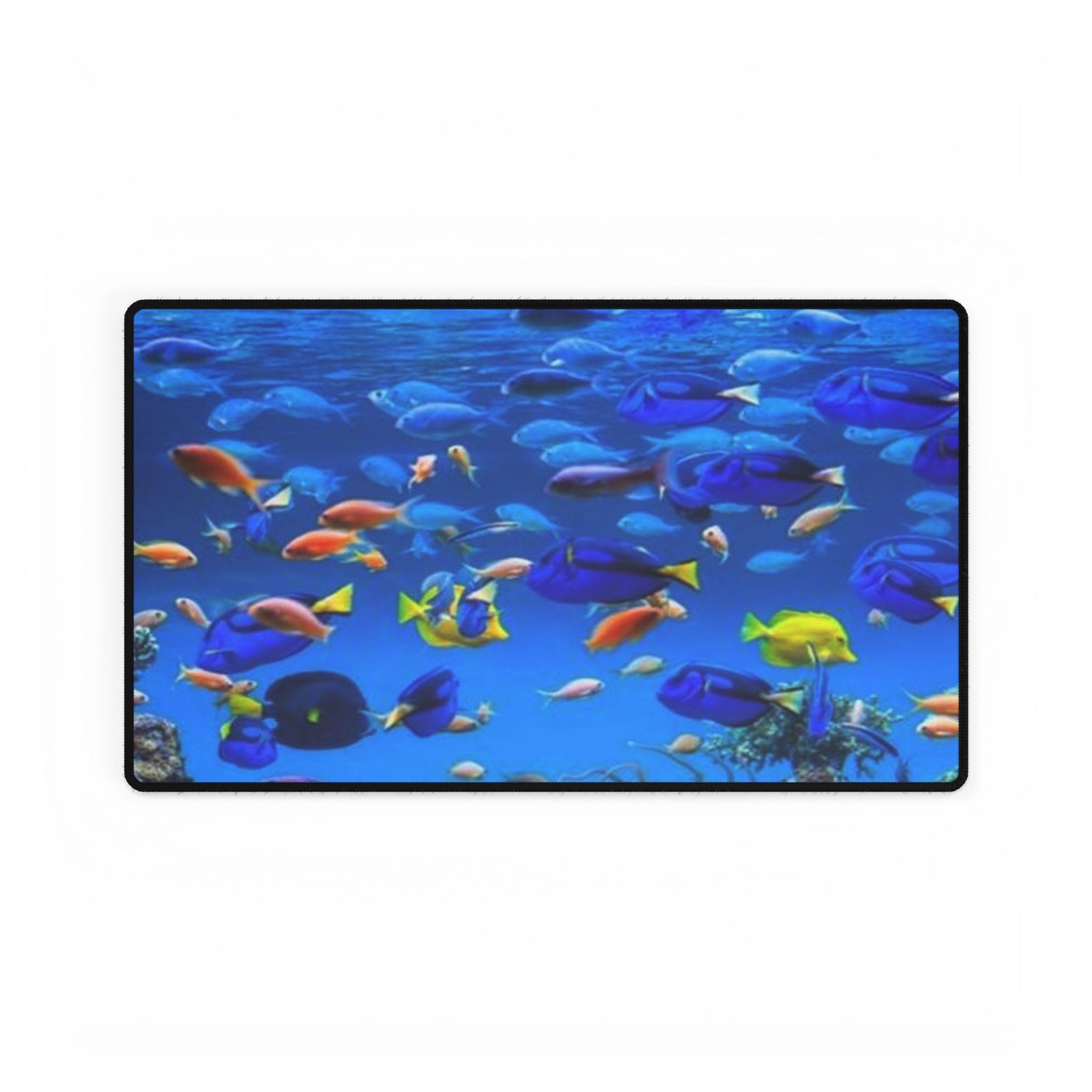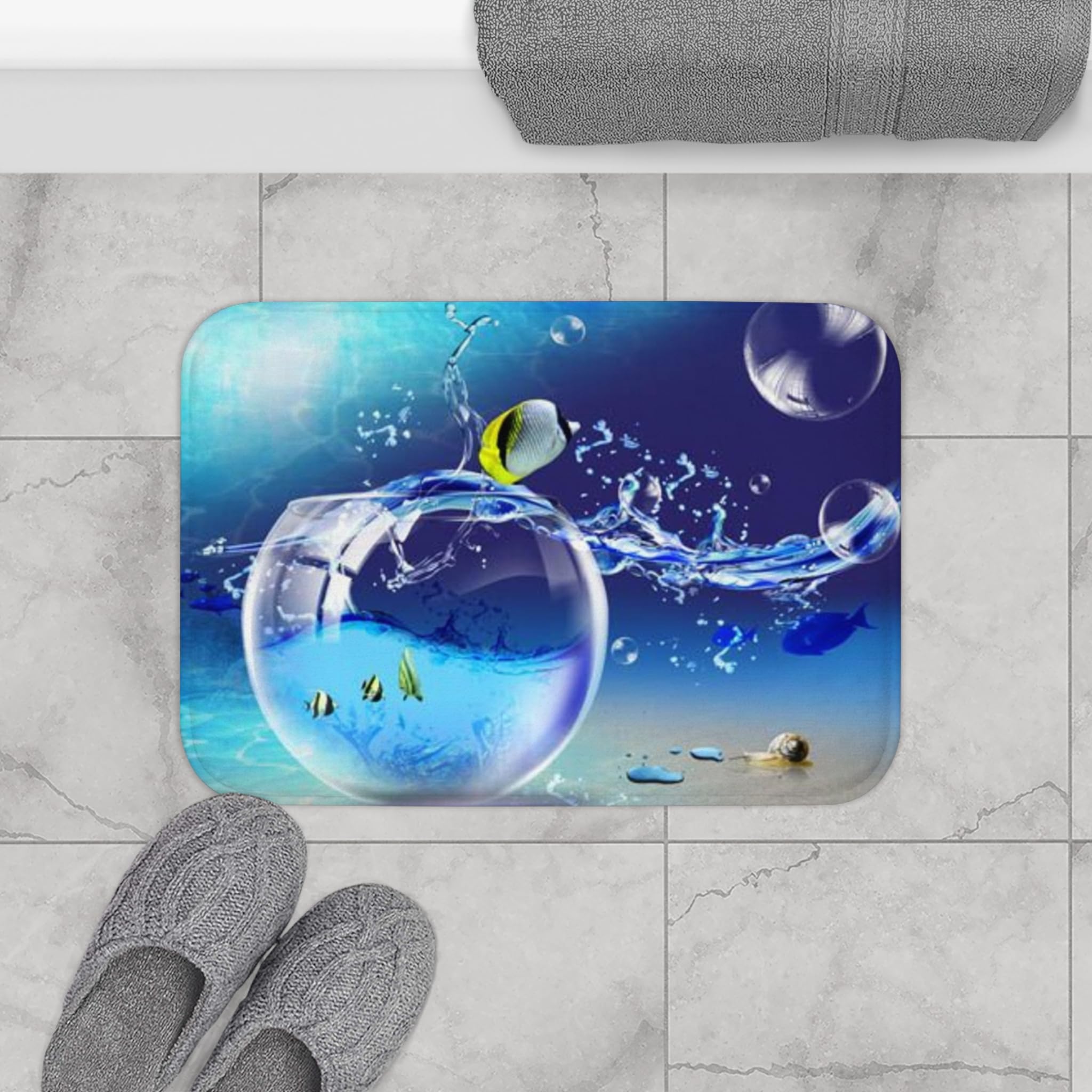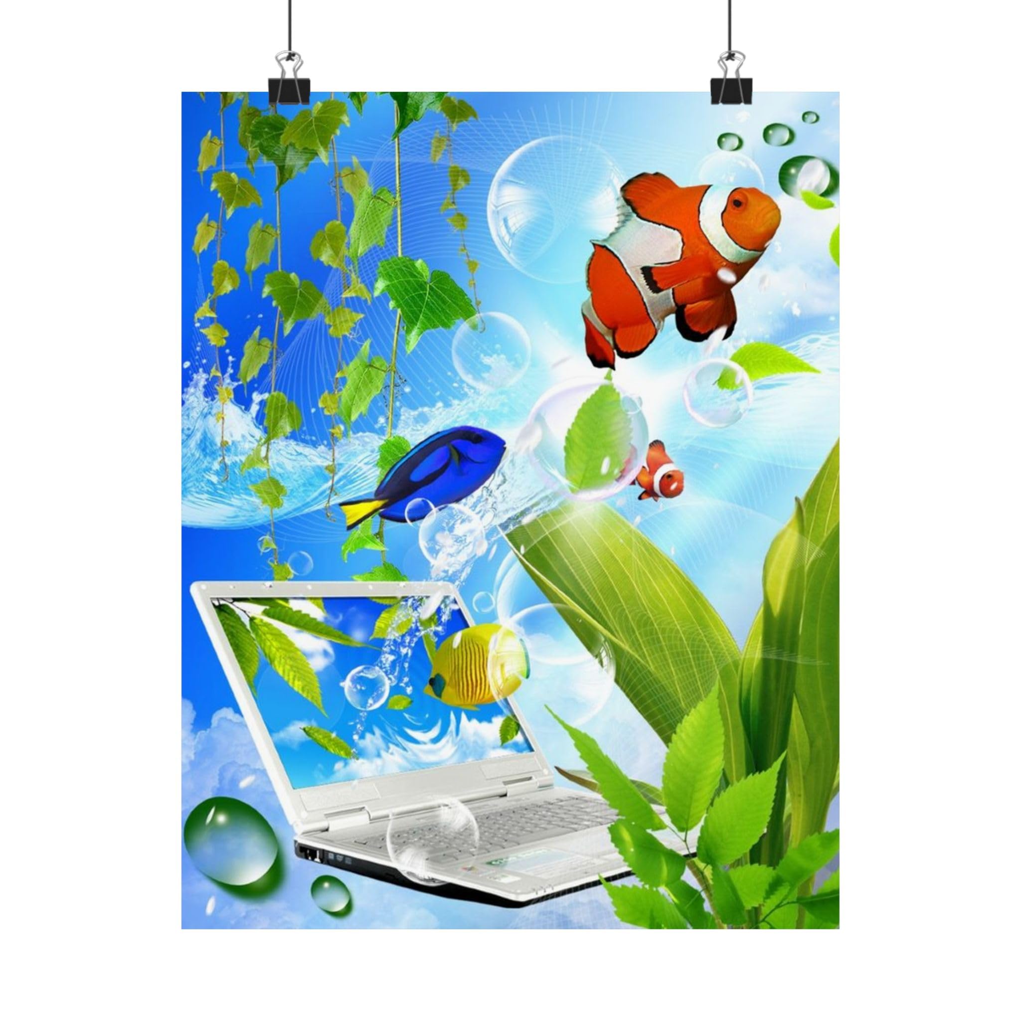 Vibrant Frutiger Aero tropical fish species—clownfish, yellow tangs, butterflyfish, angelfish, and blue tangs—shown in glossy, bubbly marine scenes across lamps, prints, and decor. A visual survey of the lively species that define the aesthetic’s underwater palette.