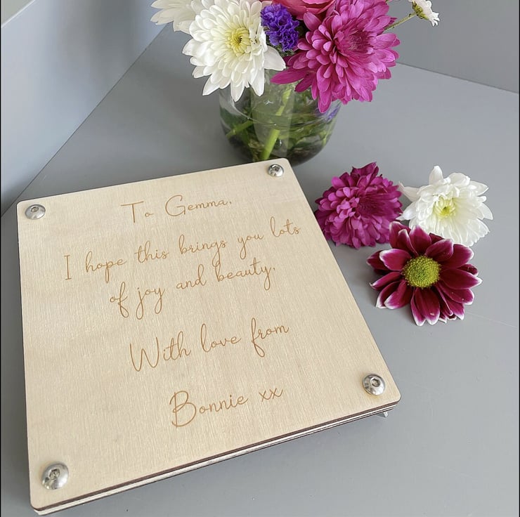 A beautifully designed flower press that allows for personal touches, suitable for gifting and large enough for a variety of blooms[1].