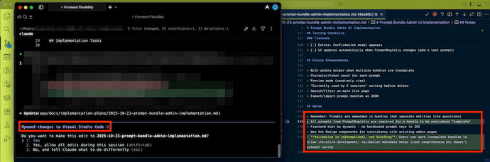 A terminal session using Claude Code to plan and execute multi-file refactors, alongside a VS Code integration panel.